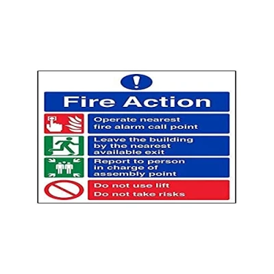 Provides essential information regarding action to be taken in the event of a fire Conforms to EN ISO 7010:2012 Portrait Orientation. Sign reads "Fire Action. Operate Nearest Fire Alarm Call Point. Leave The Building By The Nearest Available Exit. Report To Person In Charge Of Assembly Point. Do Not Use Lifts" Highly durable Self Adhesive Vinyl material and screen printed message will stand the test of time Sign measures 300 x 400mm. Self Adhesive material will adhere securely to most surfaces