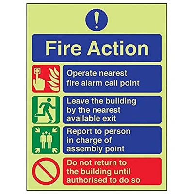 Provides essential information regarding action to be taken in the event of a fire Conforms to EN ISO 7010:2012 Portrait Orientation. Sign reads "Fire Action. Operate Nearest Fire Alarm Call Point. Leave The Building By The Nearest Available Exit. Report To Person In Charge Of Assembly Point" Highly durable Glow In The Dark 1mm plastic material and screen printed message will stand the test of time Sign measures 150 x 200mm.