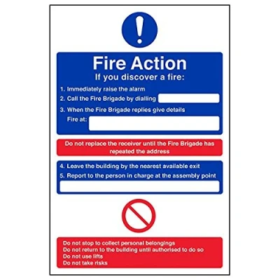 Provides essential information regarding action to be taken in the event of a fire Conforms to EN ISO 7010:2012 Portrait Orientation. Sign reads "Fire Action. If You Discover A Fire: Immediately Raise The Alarm. Call The Fire Brigade. When The Fire Brigade Replies Give Details" Highly durable Self Adhesive Vinyl material and screen printed message will stand the test of time Sign measures 200 x 300mm. Self Adhesive material will adhere securely to most surfaces