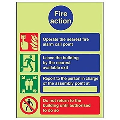 Provides essential information regarding action to be taken in the event of a fire Conforms to EN ISO 7010:2012 Portrait Orientation. Sign reads "Fire Action. Operate The Nearest Fire Alarm Call Point. Leave The Building By The Nearest Available Exit" Highly durable Glow In The Dark 1mm plastic material and screen printed message will stand the test of time Sign measures 150 x 200mm.