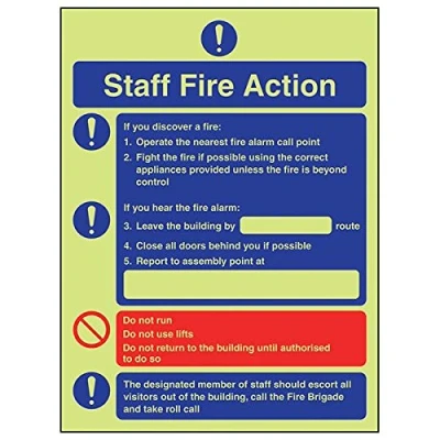 Provides essential information regarding action to be taken in the event of a fire Conforms to EN ISO 7010:2012 Portrait Orientation. Sign reads "Staff Fire Action. If You Discover A Fire: Operate The Nearest Fire Alarm Call Point. Fight The Fire If Possible" Highly durable Glow In The Dark 1mm plastic material and screen printed message will stand the test of time Sign measures 150 x 200mm.