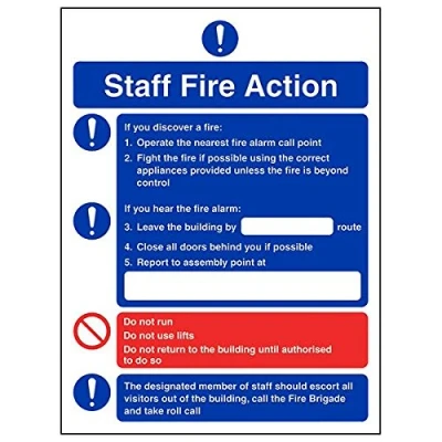 Provides essential information regarding action to be taken in the event of a fire Conforms to EN ISO 7010:2012 Portrait Orientation. Sign reads "Staff Fire Action. If You Discover A Fire: Operate The Nearest Fire Alarm Call Point. Fight The Fire If Possible" Highly durable Self Adhesive Vinyl material and screen printed message will stand the test of time Sign measures 150 x 200mm. Self Adhesive material will adhere securely to most surfaces