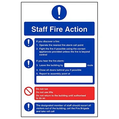 Provides essential information regarding action to be taken in the event of a fire Conforms to EN ISO 7010:2012 Portrait Orientation. Sign reads "Staff Fire Action. If You Discover A Fire: Operate The Nearest Fire Alarm Call Point. Fight The Fire If Possible" Highly durable Self Adhesive Vinyl material and screen printed message will stand the test of time Sign measures 200 x 300mm. Self Adhesive material will adhere securely to most surfaces