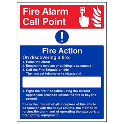 Provides essential information regarding action to be taken in the event of a fire Conforms to EN ISO 7010:2012 Portrait Orientation. Sign reads "Fire Alarm Call Point. Fire Action. On Discovering A Fire: Raise The Alarm. Ensure The Caravan Or Building Is Evacuated. Call The Fire Brigade On 999" Highly durable 1mm plastic material and screen printed message will stand the test of time Sign measures 300 x 400mm.