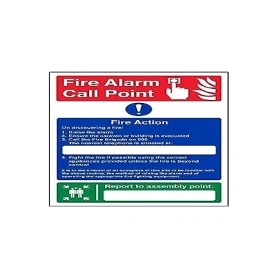 Provides essential information regarding action to be taken in the event of a fire Conforms to EN ISO 7010:2012 Portrait Orientation. Sign reads "Fire Alarm Call Point. Fire Action. On Discovering A Fire: Raise The Alarm. Ensure The Caravan Or Building Is Evacuated. Report To Assembly point" Highly durable Self Adhesive Vinyl material and screen printed message will stand the test of time Sign measures 200 x 300mm. Self Adhesive material will adhere securely to most surfaces