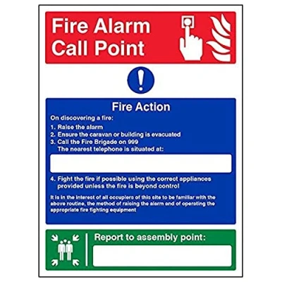 Provides essential information regarding action to be taken in the event of a fire Conforms to EN ISO 7010:2012 Portrait Orientation. Sign reads "Fire Alarm Call Point. Fire Action. On Discovering A Fire: Raise The Alarm. Ensure The Caravan Or Building Is Evacuated. Report To Assembly point" Highly durable 1mm plastic material and screen printed message will stand the test of time Sign measures 300 x 400mm.