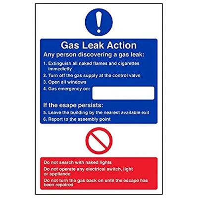 Provides essential information regarding action to be taken in the event of a fire Conforms to EN ISO 7010:2012 Portrait Orientation. Sign reads "Gas Leak Action. Any Person Discovering A Gas Leak: Extinguish All Naked Flames And Cigarettes Immediately. Turn Off The Gas Supply At The Control Valve" Highly durable Self Adhesive Vinyl material and screen printed message will stand the test of time Sign measures 200 x 300mm. Self Adhesive material will adhere securely to most surfaces