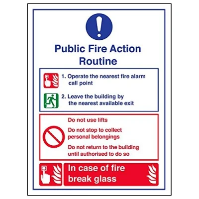 Provides essential information regarding action to be taken in the event of a fire Conforms to EN ISO 7010:2012 Portrait Orientation. Sign reads "Public Fire Action Routine. Operate The Nearest Fire Alarm Call Point. Leave The Building By The Nearest Available Exit. Do Not Use Lifts" Highly durable Glow In The Dark 1mm plastic material and screen printed message will stand the test of time Sign measures 150 x 200mm.