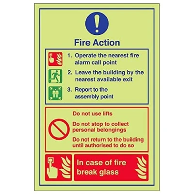 Provides essential information regarding action to be taken in the event of a fire Conforms to EN ISO 7010:2012 Portrait Orientation. Sign reads "Fire Action. Operate The Nearest Fire Alarm Call Point. Leave The Building By The Nearest Available Exit. Report To The Assembly Point" Highly durable Glow In The Dark 1mm plastic material and screen printed message will stand the test of time Sign measures 200 x 300mm.