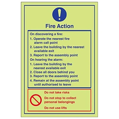 Provides essential information regarding action to be taken in the event of a fire Conforms to EN ISO 7010:2012 Portrait Orientation. Sign reads "Fire Action. On Discovering A Fire: Operate The Nearest Fire Alarm Call Point. Leave The Building By The Nearest Available Exit. Report To The Assembly Point" Highly durable Glow In The Dark 1mm plastic material and screen printed message will stand the test of time Sign measures 200 x 300mm.