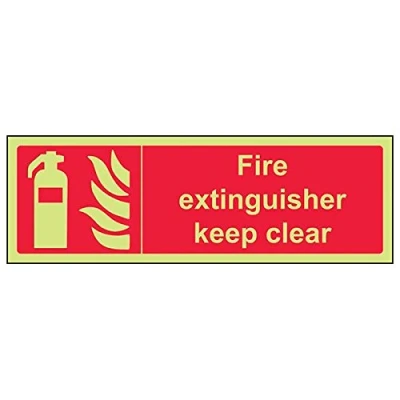 Helps fulfil obligations to convey essential information relating to fire fighting equipment as per Health and Safety (Safety Signs & Signals) Regulations 1996 Conforms to EN ISO 7010:2012 Landscape Orientation. Sign reads "Fire Extinguisher Keep Clear" Highly durable Glow In The Dark 1mm plastic material and screen printed message will stand the test of time Sign measures 300 x 100mm.