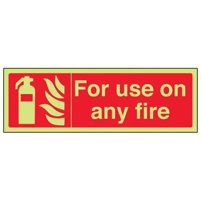Helps fulfil obligations to convey essential information relating to fire fighting equipment as per Health and Safety (Safety Signs & Signals) Regulations 1996 Conforms to EN ISO 7010:2012 Landscape Orientation. Sign reads "For Use On Any Fire" Highly durable Glow In The Dark 1mm plastic material and screen printed message will stand the test of time Sign measures 300 x 100mm