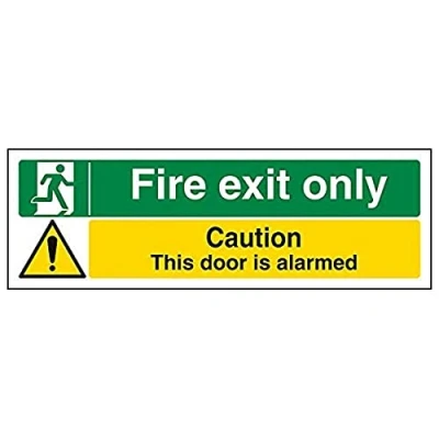 Helps to fulfil obligations to identify escape routes in a fire emergency for all members of staff and visitors as per Health and Safety (Safety Signs & Signals) Regulations 1996 Conforms to EN ISO 7010:2012 by featuring a green background with a white pictogram or text positioned centrally Landscape Orientation. Sign reads "Fire Exit Only. Caution This Door Is Alarmed" Highly durable Self Adhesive Vinyl material and screen printed message will stand the test of time Sign measures 300 x 100mm. Self Adhesive material will adhere securely to most surfaces