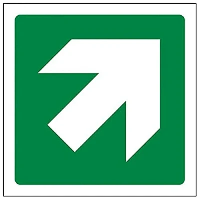 Helps to fulfil obligations to identify escape routes in a fire emergency for all members of staff and visitors as per Health and Safety (Safety Signs & Signals) Regulations 1996 Conforms to EN ISO 7010:2012 by featuring a green background with a white pictogram or text positioned centrally Square Orientation. Sign features ISO compliant Diagonal Arrow Highly durable Self Adhesive Vinyl material and screen printed message will stand the test of time Sign measures 100 x 100mm. Self Adhesive material will adhere securely to most surfaces