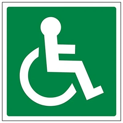 Helps to fulfil obligations to identify escape routes in a fire emergency for all members of staff and visitors as per Health and Safety (Safety Signs & Signals) Regulations 1996 Conforms to EN ISO 7010:2012 by featuring a green background with a white pictogram or text positioned centrally Square Orientation. Sign features ISO compliant Right Facing Wheel Chair Logo Highly durable Self Adhesive Vinyl material and screen printed message will stand the test of time Sign measures 150 x 150mm. Self Adhesive material will adhere securely to most surfaces