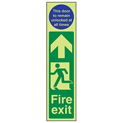 Helps to fulfil obligations to show vital escape route information about fire doors for all employees and visitors as per Health and Safety (Safety Signs & Signals) Regulations 1996 Conforms to EN ISO 7010:2012 Portrait Orientation. Sign reads "This Door To Remain Unlocked At All Times. Fire Exit" Highly durable Glow In The Dark 1mm plastic material and screen printed message will stand the test of time Sign measures 75 x 300mm.
