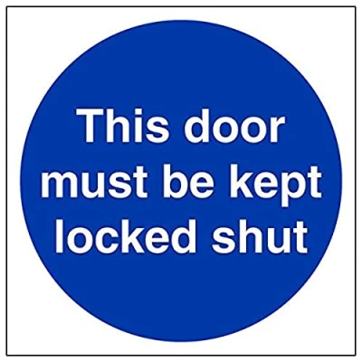 Helps to fulfil obligations to show vital escape route information about fire doors for all employees and visitors as per Health and Safety (Safety Signs & Signals) Regulations 1996 Conforms to EN ISO 7010:2012 Square Orientation. Sign reads "This Door Must Be Kept Locked Shut" Highly durable Self Adhesive Vinyl material and screen printed message will stand the test of time Sign measures 150 x 150mm. Self Adhesive material will adhere securely to most surfaces