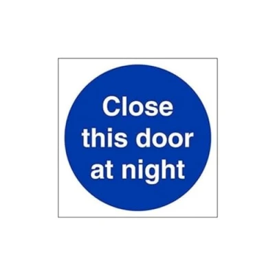 Helps to fulfil obligations to show vital escape route information about fire doors for all employees and visitors as per Health and Safety (Safety Signs & Signals) Regulations 1996 Conforms to EN ISO 7010:2012 Square Orientation. Sign reads "Close This Door At Night" Highly durable Self Adhesive Vinyl material and screen printed message will stand the test of time Sign measures 150 x 150mm. Self Adhesive material will adhere securely to most surfaces