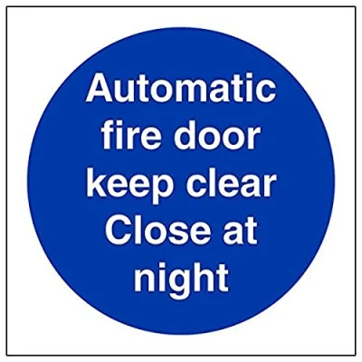 Helps to fulfil obligations to show vital escape route information about fire doors for all employees and visitors as per Health and Safety (Safety Signs & Signals) Regulations 1996 Conforms to EN ISO 7010:2012 Square Orientation. Sign reads "Automatic Fire Door Keep Clear. Close At Night" Highly durable Self Adhesive Vinyl material and screen printed message will stand the test of time Sign measures 100 x 100mm. Self Adhesive material will adhere securely to most surfaces