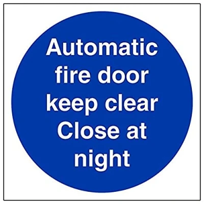 Helps to fulfil obligations to show vital escape route information about fire doors for all employees and visitors as per Health and Safety (Safety Signs & Signals) Regulations 1996 Conforms to EN ISO 7010:2012 Square Orientation. Sign reads "Automatic Fire Door Keep Clear. Close At Night" Highly durable Self Adhesive Vinyl material and screen printed message will stand the test of time Sign measures 150 x 150mm. Self Adhesive material will adhere securely to most surfaces