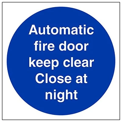 Helps to fulfil obligations to show vital escape route information about fire doors for all employees and visitors as per Health and Safety (Safety Signs & Signals) Regulations 1996 Conforms to EN ISO 7010:2012 Square Orientation. Sign reads "Automatic Fire Door Keep Clear. Close At Night" Highly durable 1mm plastic material and screen printed message will stand the test of time Sign measures 200 x 200mm.