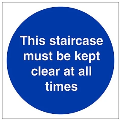 Helps to fulfil obligations to show vital escape route information about fire doors for all employees and visitors as per Health and Safety (Safety Signs & Signals) Regulations 1996 Conforms to EN ISO 7010:2012 Square Orientation. Sign reads "Staircase Must Be Kept Clear At All Times" Highly durable Self Adhesive Vinyl material and screen printed message will stand the test of time Sign measures 200 x 200mm. Self Adhesive material will adhere securely to most surfaces