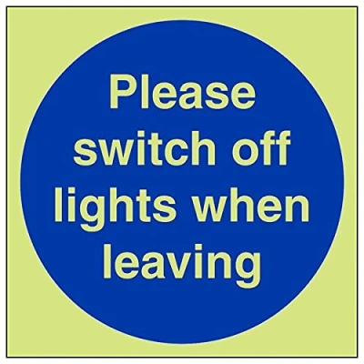 Helps to fulfil obligations to show vital escape route information about fire doors for all employees and visitors as per Health and Safety (Safety Signs & Signals) Regulations 1996 Conforms to EN ISO 7010:2012 Square Orientation. Sign reads "Please Switch Off Lights When Leaving" Highly durable Glow In The Dark 1mm plastic material and screen printed message will stand the test of time Sign measures 150 x 150mm.