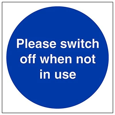 Helps to fulfil obligations to show vital escape route information about fire doors for all employees and visitors as per Health and Safety (Safety Signs & Signals) Regulations 1996 Conforms to EN ISO 7010:2012 Square Orientation. Sign reads "Please Switch Off When Not In Use" Highly durable Self Adhesive Vinyl material and screen printed message will stand the test of time Sign measures 150 x 150mm. Self Adhesive material will adhere securely to most surfaces