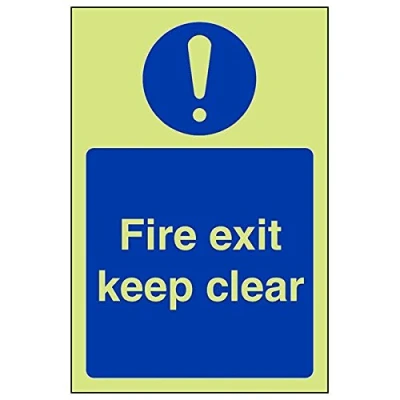Helps to fulfil obligations to show vital escape route information about fire doors for all employees and visitors as per Health and Safety (Safety Signs & Signals) Regulations 1996 Conforms to EN ISO 7010:2012 Portrait Orientation. Sign reads "Fire Exit Keep Clear" Highly durable Glow In The Dark 1mm plastic material and screen printed message will stand the test of time Sign measures 100 x 150mm.
