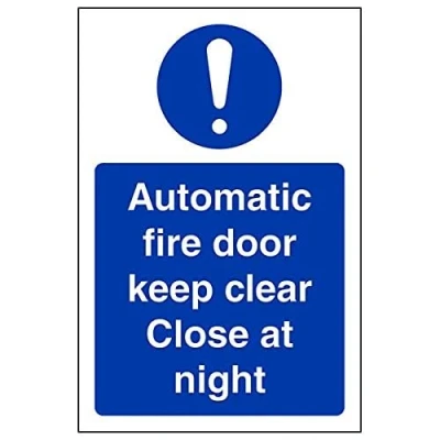 Helps to fulfil obligations to show vital escape route information about fire doors for all employees and visitors as per Health and Safety (Safety Signs & Signals) Regulations 1996 Conforms to EN ISO 7010:2012 Portrait Orientation. Sign reads "Automatic Fire Door Keep Clear. Close At Night" Highly durable Self Adhesive Vinyl material and screen printed message will stand the test of time Sign measures 100 x 150mm. Self Adhesive material will adhere securely to most surfaces