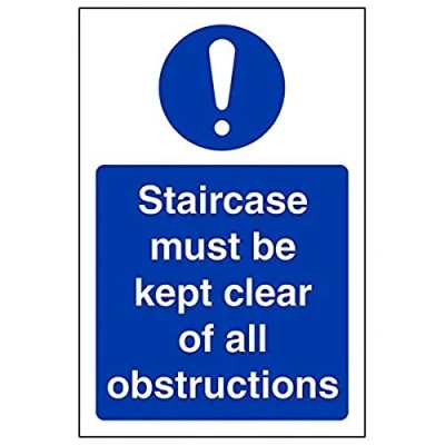 Helps to fulfil obligations to show vital escape route information about fire doors for all employees and visitors as per Health and Safety (Safety Signs & Signals) Regulations 1996 Conforms to EN ISO 7010:2012 Portrait Orientation. Sign reads "Staircase Must Be Kept Clear Of All Obstructions" Highly durable 1mm plastic material and screen printed message will stand the test of time Sign measures 100 x 150mm.