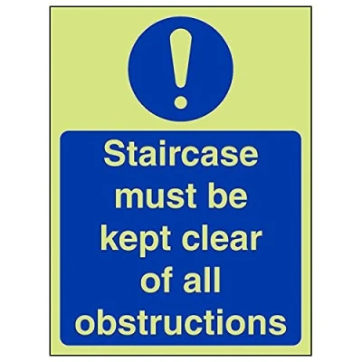 Helps to fulfil obligations to show vital escape route information about fire doors for all employees and visitors as per Health and Safety (Safety Signs & Signals) Regulations 1996 Conforms to EN ISO 7010:2012 Portrait Orientation. Sign reads "Staircase Must Be Kept Clear Of All Obstructions" Highly durable Glow In The Dark 1mm plastic material and screen printed message will stand the test of time Sign measures 150 x 200mm.