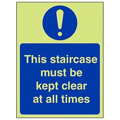 Helps to fulfil obligations to show vital escape route information about fire doors for all employees and visitors as per Health and Safety (Safety Signs & Signals) Regulations 1996 Conforms to EN ISO 7010:2012 Portrait Orientation. Sign reads "Staircase Must Be Kept Clear At All Times" Highly durable Glow In The Dark 1mm plastic material and screen printed message will stand the test of time Sign measures 150 x 200mm.