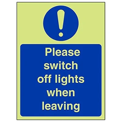 Helps to fulfil obligations to show vital escape route information about fire doors for all employees and visitors as per Health and Safety (Safety Signs & Signals) Regulations 1996 Conforms to EN ISO 7010:2012 Portrait Orientation. Sign reads "Please Switch Off Lights When Leaving" Highly durable Glow In The Dark 1mm plastic material and screen printed message will stand the test of time Sign measures 150 x 200mm.