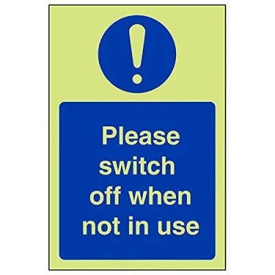 Helps to fulfil obligations to show vital escape route information about fire doors for all employees and visitors as per Health and Safety (Safety Signs & Signals) Regulations 1996 Conforms to EN ISO 7010:2012 Portrait Orientation. Sign reads "Please Switch Off When Not In Use" Highly durable Glow In The Dark 1mm plastic material and screen printed message will stand the test of time Sign measures 100 x 150mm.