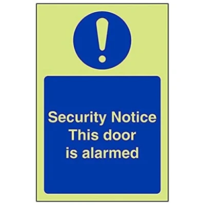 Helps to fulfil obligations to show vital escape route information about fire doors for all employees and visitors as per Health and Safety (Safety Signs & Signals) Regulations 1996 Conforms to EN ISO 7010:2012 Portrait Orientation. Sign reads "Security Notice. This Door Is Alarmed" Highly durable Glow In The Dark 1mm plastic material and screen printed message will stand the test of time Sign measures 100 x 150mm.
