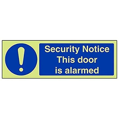 Helps to fulfil obligations to show vital escape route information about fire doors for all employees and visitors as per Health and Safety (Safety Signs & Signals) Regulations 1996 Conforms to EN ISO 7010:2012 Landscape Orientation. Sign reads "Security Notice. This Door Is Alarmed" Highly durable Glow In The Dark 1mm plastic material and screen printed message will stand the test of time Sign measures 300 x 100mm.