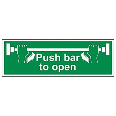 Helps to fulfil legal obligations to inform of the direction in which safety can be reached as per Health and Safety (Safety Signs & Signals) Regulations 1996 Conforms to EN ISO 7010:2012 by featuring a green background with a white pictogram or text positioned centrally Landscape Orientation. Sign reads "Push Bar To Open" Highly durable 1mm plastic material and screen printed message will stand the test of time Sign measures 450 x 150mm.