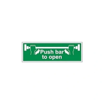 Helps to fulfil legal obligations to inform of the direction in which safety can be reached as per Health and Safety (Safety Signs & Signals) Regulations 1996 Conforms to EN ISO 7010:2012 by featuring a green background with a white pictogram or text positioned centrally Landscape Orientation. Sign reads "Push Bar To Open" Highly durable Self Adhesive Vinyl material and screen printed message will stand the test of time Sign measures 450 x 150mm. Self Adhesive material will adhere securely to most surfaces