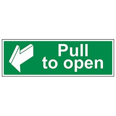 Helps to fulfil legal obligations to inform of the direction in which safety can be reached as per Health and Safety (Safety Signs & Signals) Regulations 1996 Conforms to EN ISO 7010:2012 by featuring a green background with a white pictogram or text positioned centrally Landscape Orientation. Sign reads "Pull To Open" Highly durable Self Adhesive Vinyl material and screen printed message will stand the test of time Sign measures 600 x 200mm. Self Adhesive material will adhere securely to most surfaces