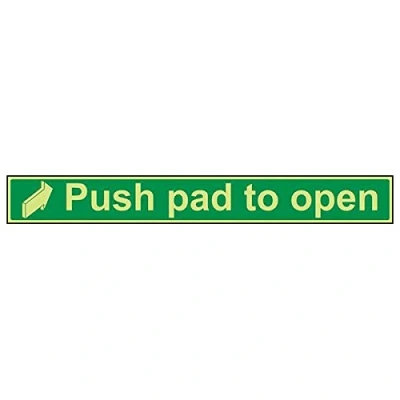 Helps to fulfil legal obligations to inform of the direction in which safety can be reached as per Health and Safety (Safety Signs & Signals) Regulations 1996 Conforms to EN ISO 7010:2012 by featuring a green background with a white pictogram or text positioned centrally Landscape Orientation. Sign reads "Push Pad To Open" Highly durable Glow In The Dark 1mm plastic material and screen printed message will stand the test of time Sign measures 600 x 75mm.