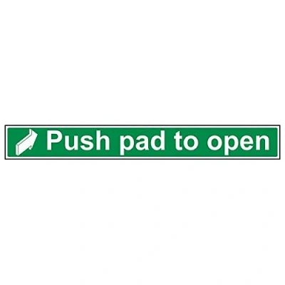 Helps to fulfil legal obligations to inform of the direction in which safety can be reached as per Health and Safety (Safety Signs & Signals) Regulations 1996 Conforms to EN ISO 7010:2012 by featuring a green background with a white pictogram or text positioned centrally Landscape Orientation. Sign reads "Push Pad To Open" Highly durable Self Adhesive Vinyl material and screen printed message will stand the test of time Sign measures 600 x 75mm. Self Adhesive material will adhere securely to most surfaces
