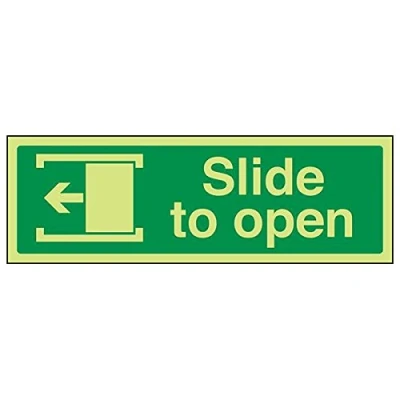 Helps to fulfil legal obligations to inform of the direction in which safety can be reached as per Health and Safety (Safety Signs & Signals) Regulations 1996 Conforms to EN ISO 7010:2012 by featuring a green background with a white pictogram or text positioned centrally Landscape Orientation. Sign reads "Slide To Open" Highly durable Glow In The Dark 1mm plastic material and screen printed message will stand the test of time Sign measures 300 x 100mm.