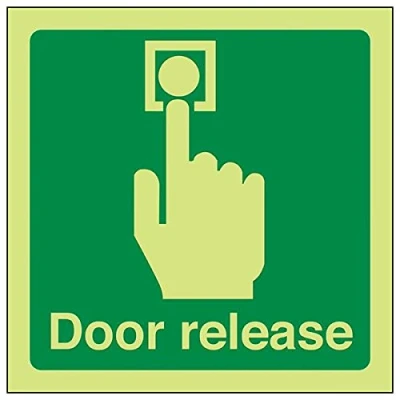 Helps to fulfil legal obligations to inform of the direction in which safety can be reached as per Health and Safety (Safety Signs & Signals) Regulations 1996 Conforms to EN ISO 7010:2012 by featuring a green background with a white pictogram or text positioned centrally Square Orientation. Sign reads "Door Release" Highly durable Glow In The Dark 1mm plastic material and screen printed message will stand the test of time Sign measures 100 x 100mm.