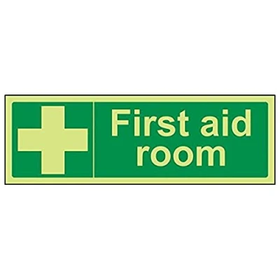 Helps to fulfil obligations to inform of where first aid supplies are kept as per First Aid At Work Regulations, as well as Health and Safety (Safety Signs & Signals) Regulations 1996 Conforms to EN ISO 7010:2012 Landscape Orientation. Sign reads "First Aid Room" Highly durable Glow In The Dark 1mm plastic material and screen printed message will stand the test of time Sign measures 300 x 100mm.