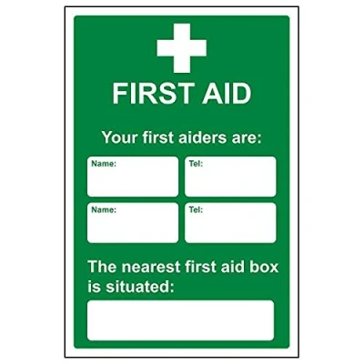 Helps to fulfil obligations to inform of where first aid supplies are kept as per First Aid At Work Regulations, as well as Health and Safety (Safety Signs & Signals) Regulations 1996 Conforms to EN ISO 7010:2012 Portrait Orientation. Sign reads "First Aid. Your First Aiders Are: The Nearest First Aid Box Is Situated:" Highly durable 1mm plastic material and screen printed message will stand the test of time Sign measures 200 x 300mm.