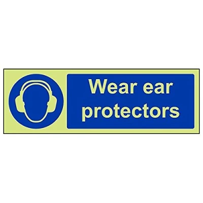 Helps to fulfil legal obligations to remind staff and visitors to wear the appropriate PPE when required to ensure personal safety as per Health and Safety (Safety Signs & Signals) Regulations 1996 Conforms to EN ISO 7010:2012 - Mandatory Signs feature a round symbol with a blue background of at least 50% of the total sign area, with a white pictogram and text Landscape Orientation. Sign reads "Wear Ear Protectors" Highly durable Glow In The Dark 1mm plastic material and screen printed message will stand the test of time Sign measures 300 x 100mm.