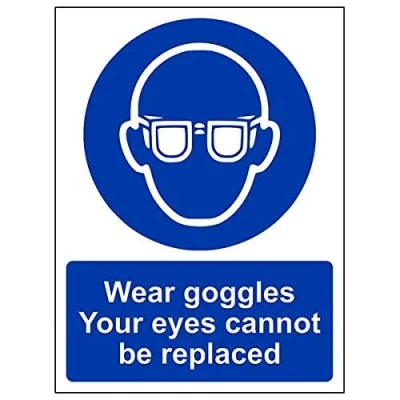 Helps to fulfil legal obligations to remind staff and visitors to wear the appropriate PPE when required to ensure personal safety as per Health and Safety (Safety Signs & Signals) Regulations 1996 Conforms to EN ISO 7010:2012 - Mandatory Signs feature a round symbol with a blue background of at least 50% of the total sign area, with a white pictogram and text Portrait Orientation. Sign reads "Wear Goggles. Your Eyes Cannot Be Replaced" Highly durable 1mm plastic material and screen printed message will stand the test of time Sign measures 150 x 200mm.