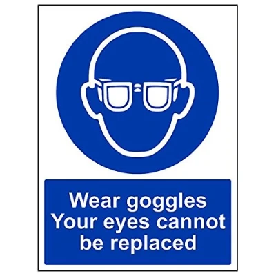 Helps to fulfil legal obligations to remind staff and visitors to wear the appropriate PPE when required to ensure personal safety as per Health and Safety (Safety Signs & Signals) Regulations 1996 Conforms to EN ISO 7010:2012 - Mandatory Signs feature a round symbol with a blue background of at least 50% of the total sign area, with a white pictogram and text Portrait Orientation. Sign reads "Wear Goggles. Your Eyes Cannot Be Replaced" Highly durable Self Adhesive Vinyl material and screen printed message will stand the test of time Sign measures 300 x 400mm. Self Adhesive material will adhere securely to most surfaces