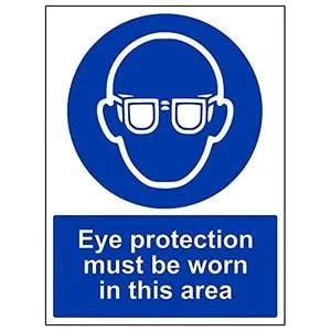 Helps to fulfil legal obligations to remind staff and visitors to wear the appropriate PPE when required to ensure personal safety as per Health and Safety (Safety Signs & Signals) Regulations 1996 Conforms to EN ISO 7010:2012 - Mandatory Signs feature a round symbol with a blue background of at least 50% of the total sign area, with a white pictogram and text Portrait Orientation. Sign reads "Eye Protection Must Be Worn In This Area" Highly durable 1mm plastic material and screen printed message will stand the test of time Sign measures 300 x 400mm.